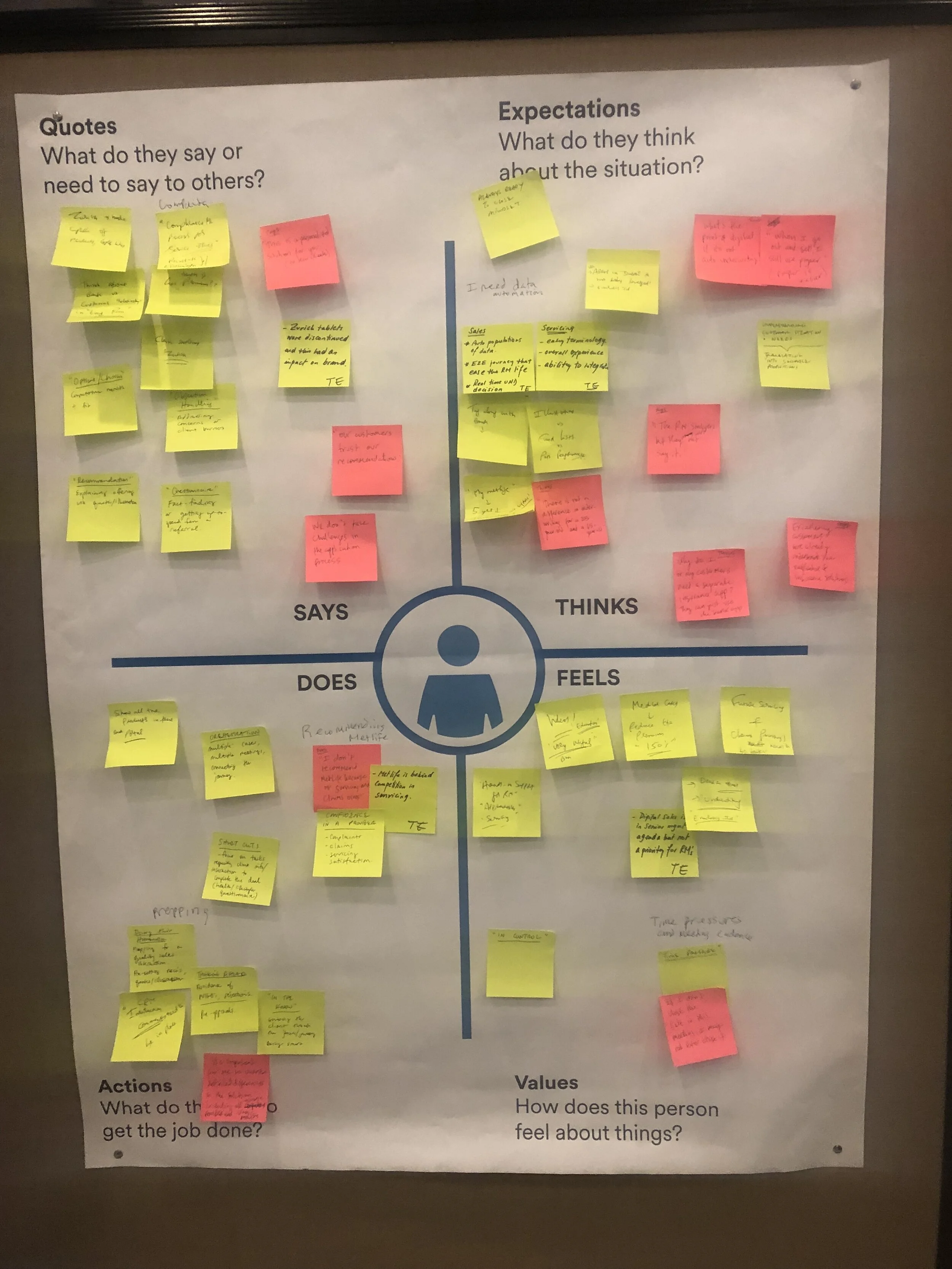 4 essential points to be mapped out during this session were Quotes (What do they say or need to say to others?), Expectations (What do they think about the situation?), Actions (What do they do to get the job done?) and Values (how does this person feel about things?).